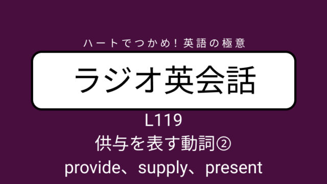 ラジオ英会話 NHKラジオ英会話のディクテーション「供与を表す動詞② ー provide、supply、present」L119 2025/9/25 2025年9月25日 ichiroan 一路庵 BLOG 〜 英語部 ディクテーション 講師陣の英会話を書きとり(スクリプト) 大西先生、デイビッドさん、ろーざさんの英会話部分を書きとってみましょう!(大西 …